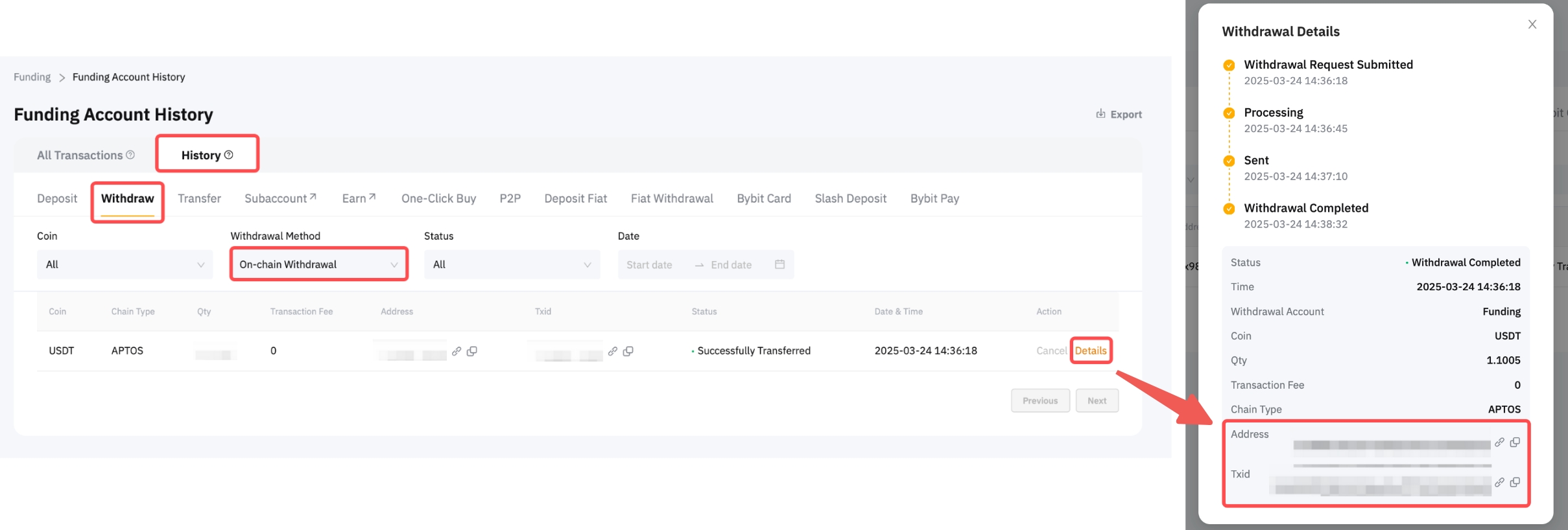 You can get the TXID from the Funding Account HistoryWithdraw page and click on the details to check your withdrawal address and TXID.