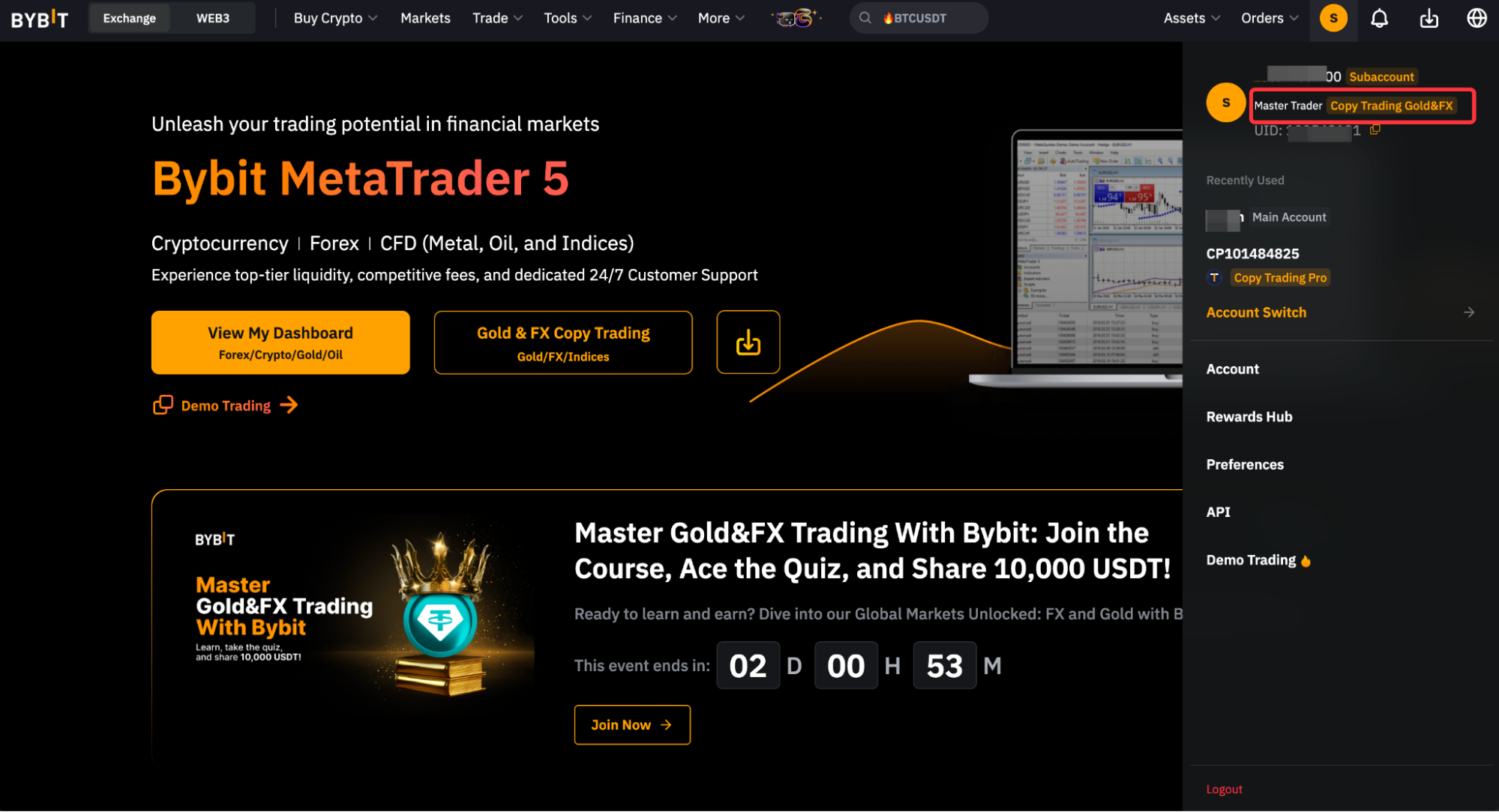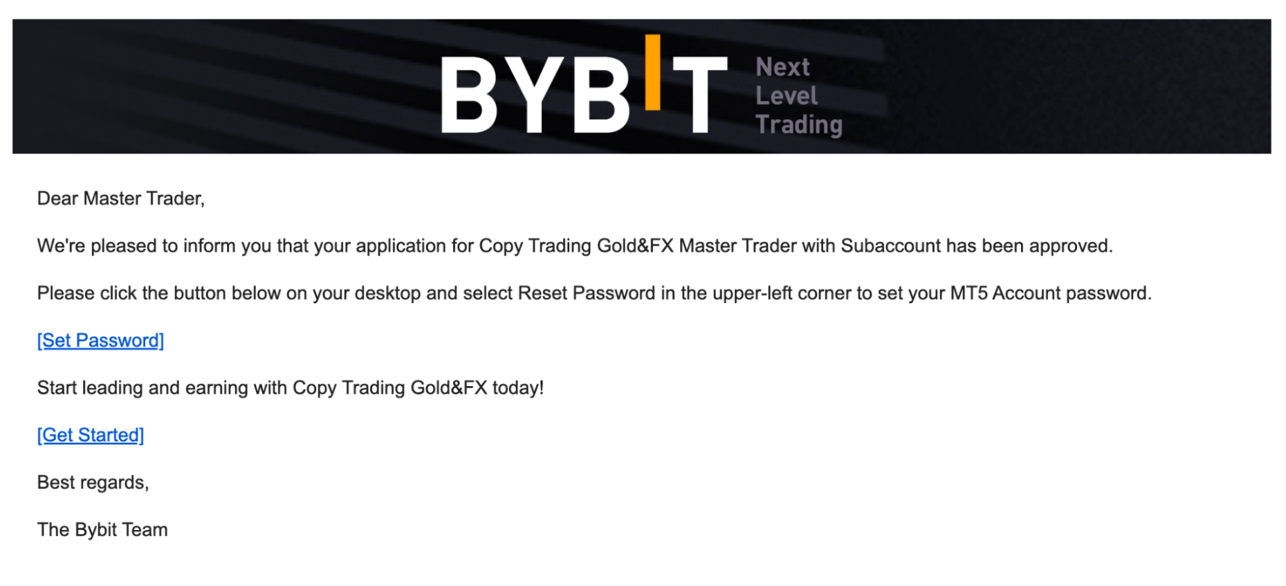 Congratulations! You are now a TradFi Master Trader. Switch to your TradFi Master Trader Subaccount and MT5 Account to start Copy Trading.