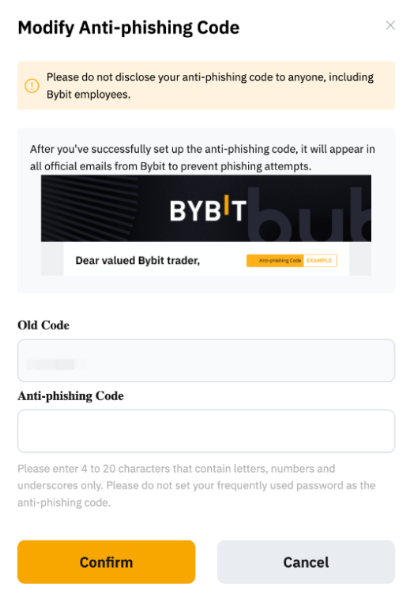 • Always set up your unique anti-phishing code from our Account & Security page. This simple step increases account security and allows users to better identify official emails sent by Bybit.