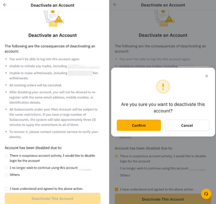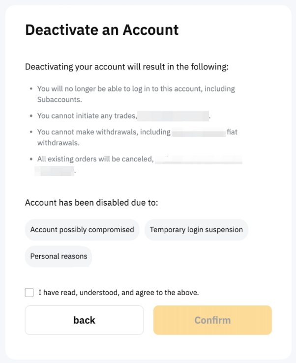 — You will not be able to log in to your Bybit account once you have confirmed account deactivation.