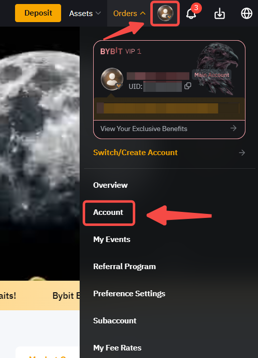 Step 1: Log in to your Bybit account and proceed to Account by clicking the profile icon in the top right corner on the Bybit page.