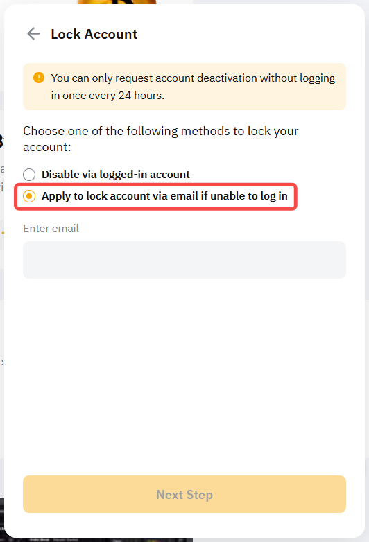 Step 3: Select Apply to lock account via email if unable to log in and enter your email address.