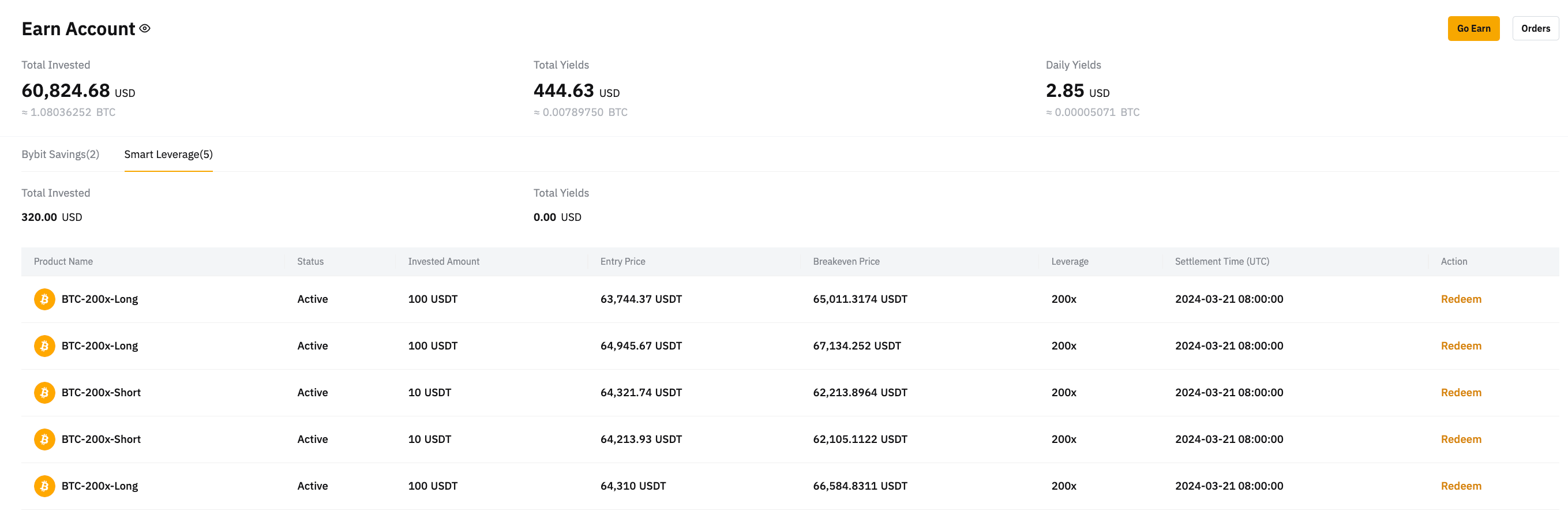 Alternatively, you can click on Assets at the top right corner of the Bybit page to enter the Earn Account page. From there, you can view your existing orders.