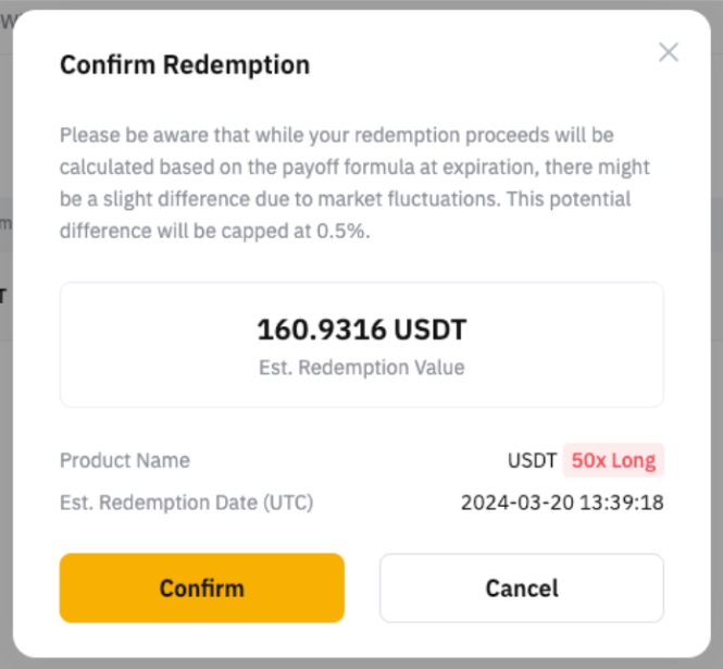 Step 2: Click on Redeem shown on the right side of your Smart Leverage plan and you will see a confirmation pop-up window. Verify the redemption details before clicking on the Confirm button.
